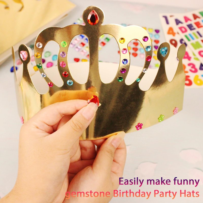 - Ideal Birthday Party Kit: classic and stylish Style includes: 20 pieces paper crowns in 4 styles (5 for each style), 6 sheets gem jewelry stickers, 10 sheets letter stickers and 10 sheets number stickers; The quantity fully meets the DIY needs of your party guests to personalize each crown