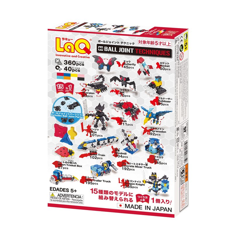 Introducing BALL JOINT TECHNIQUES! Build a BUTTERFLY, a NINJA, and a CONCRETE MIXER TRUCK, by using Ball Joint Parts which are two parts that connect together with rotating movements. The instruction guidebook shows steps to make a BUTTERFLY, ROCKET, SCORPION, BAT, BULLDOZER, NINJA, CRAB, PTERANODON, HEART TRINKET BOX, BULLET TRAIN, WINDMILL, OWL, DRAGON KNIGHT, SEMI-TRAILER TRUCK, and a CONCRETE MIXER TRUCK. Have fun by building models with rotating movements. ※Reassemble parts to make 15 models. WHAT'S LaQ? LaQ was invented to be a highly unique and creative construction toy using only 7 types of parts that makes fun snapping sounds when connecting. LaQ building stimulates the senses of sight, sound and touch, and snapping the parts together is a satisfying tactile experience promoting concentration through play. The open-ended possibilities of LaQ is limitless, and is recognized as an ideal creative toy for children as well as being an engaging creative tool for adults.