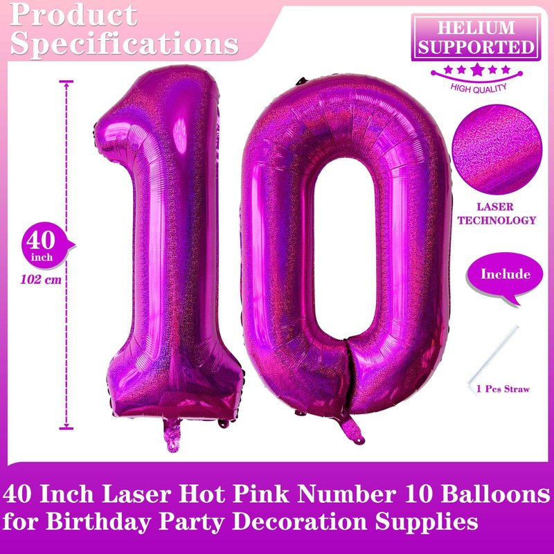 - 【Package Included】40 inch laser hot pink number 10 balloons (uninflated), 1 Pcs straw.