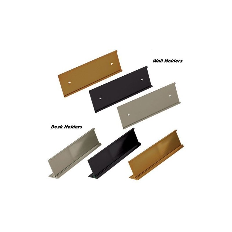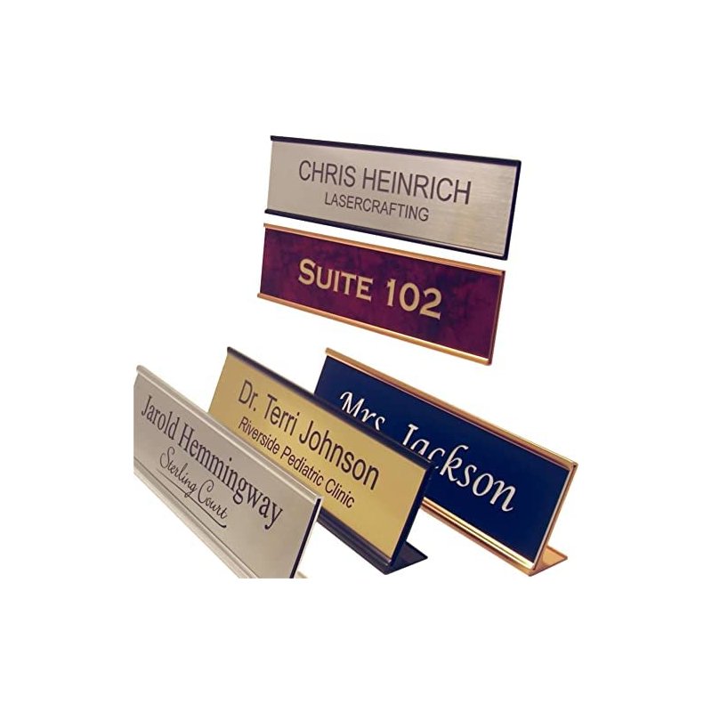 Beautiful laser engraved name plate with your choice of color and font. Includes holder of your choice, either desk or wall/door mount. Customize now!
