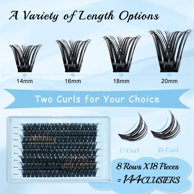 - Different lash styles & length to suit your mood: KevKev offers multiple lengths and curls for different lash look. 96 lash clusters, 10mm - 16mm in length. Try to find your own lash style at KevKev.