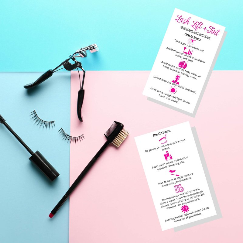 Lash Lift + Tint Aftercare Instruction Cards | 50 Pack | 2 x 3.5” inches Business Card Size | Eyelash Lift and Tint Kit at Home DIY aftercare Supplies | White with Pink Icon Design