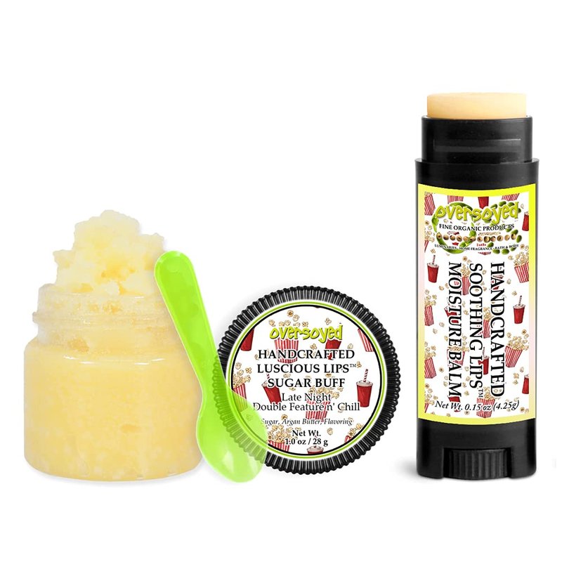 Late Night Double Feature n' Chill Soothing & Luscious Lips by OverSoyed Exfoliator & Chapped Lip Repair Lip Care Combo | Artisan Handcrafted to Order Sweet Buttery Salty Popcorn Flavored Exfoliating Sugar Lip Scrub & Lip Moisturizer Balm Gift Set