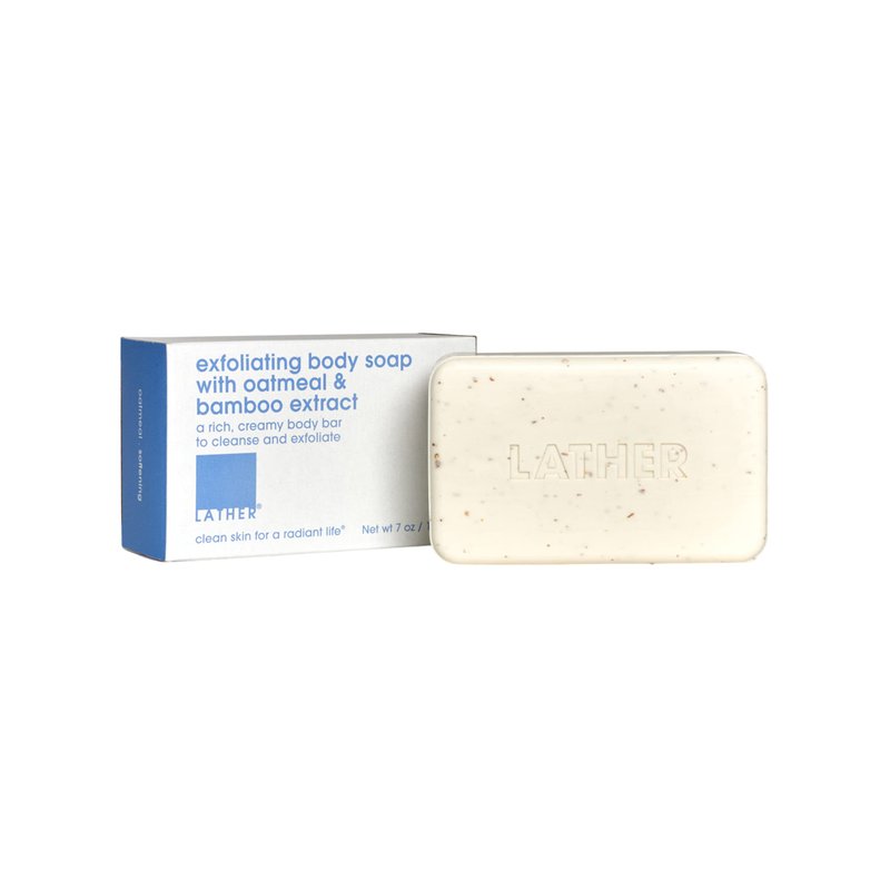 LATHER's Exfoliating Body Soap with Oatmeal and Bamboo Extract is a natural bar soap that provides a creamy lather while moisturizing and exfoliating the skin. Enriched with oatmeal and bamboo extract, this soap helps to soothe dry skin while removing dead skin cells for a refreshed, radiant complexion. The ingredients of this bar soap include soothing oatmeal and natural bamboo extract to gently exfoliate dead skin cells. This body soap also contains shea butter and olive oil that provides skin the hydration it needs. This bar soap has a luxurious and creamy lather and a mild, soothing scent from natural botanical essential oils. If you have sensitive skin, our gentle formula will leave your skin feeling soft and smooth. Our bar soap is non-drying and contains moisturizing shea butter that helps protect against dryness while leaving your skin feeling clean and refreshed. How to use: Apply to damp skin and gently massage in a circular motion. Rinse thoroughly. Skin type: All skin types We love: the 100% biodegradable and preservative-free base, that's gentle enough for even the most sensitive skin. No parabens, sulfates, mineral oil, synthetic fragrance, or colors. Vegan.