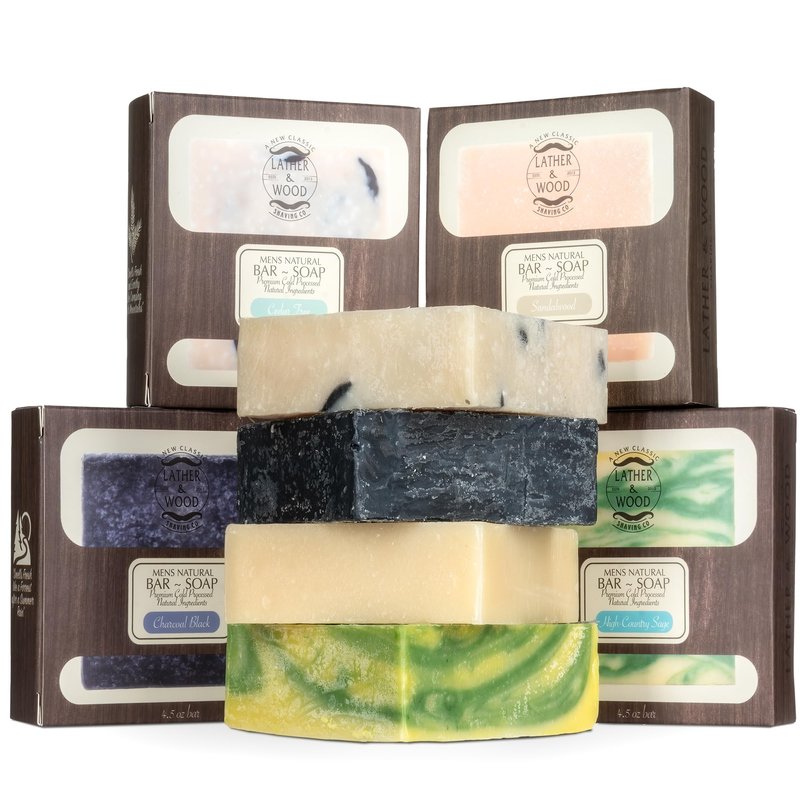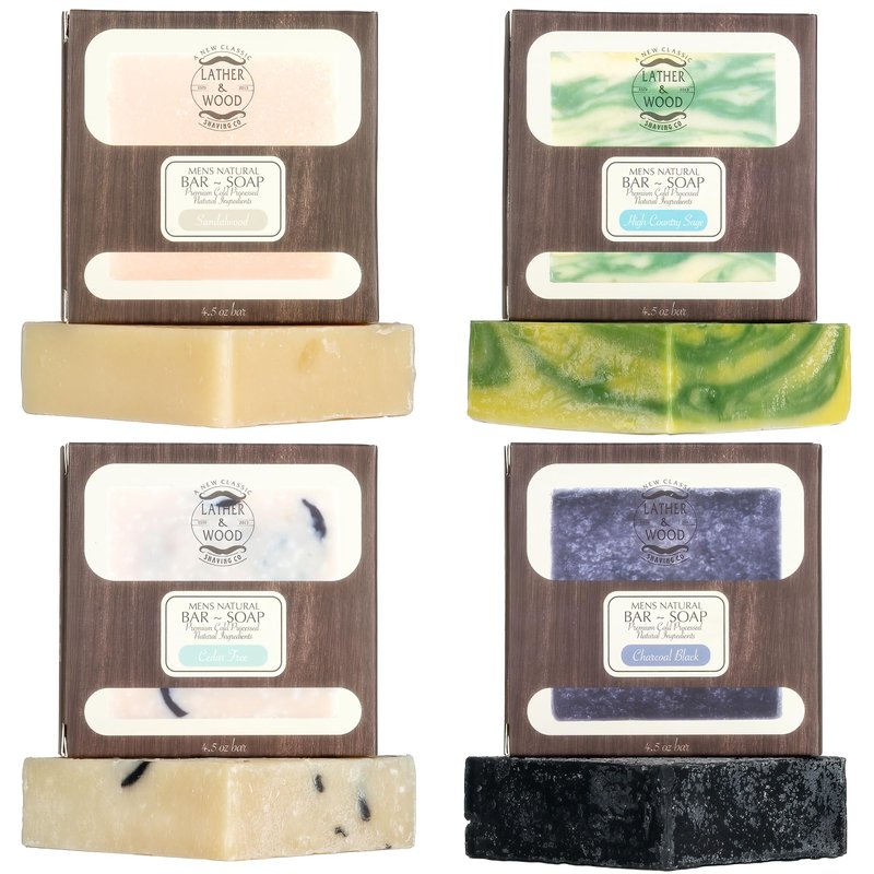 Lather & Wood Bar Soap for Men - Variety Pack - (4) 5oz Man Soap Bars for Bath, Body, and Hands - Natural and Organic Ingredients - Sandalwood - Charcoal Black - Cedar Forest - High Country Sage