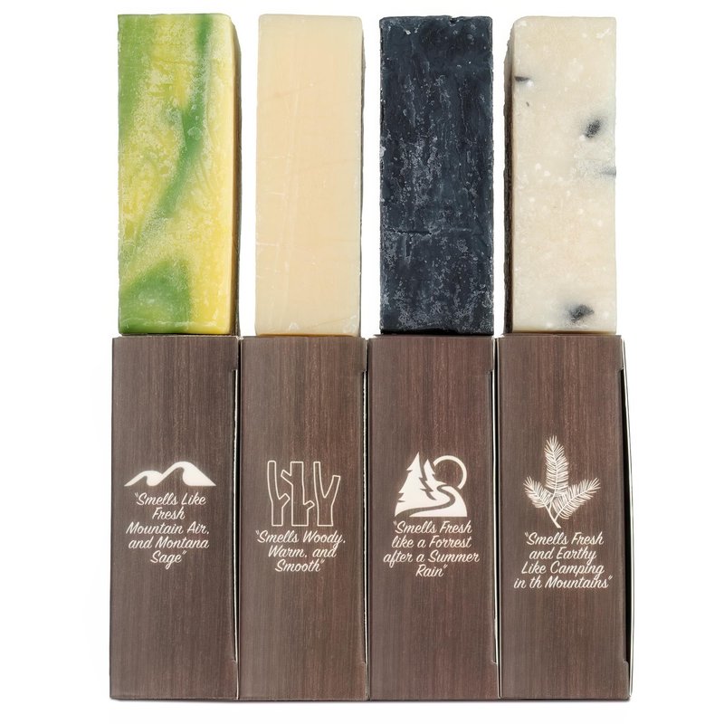 - You get 4 manly 5oz soaps. Sandalwood, Charcoal Black, Cedar Forest, and Highcountry Sage. Each lasts about 30 days of showering.