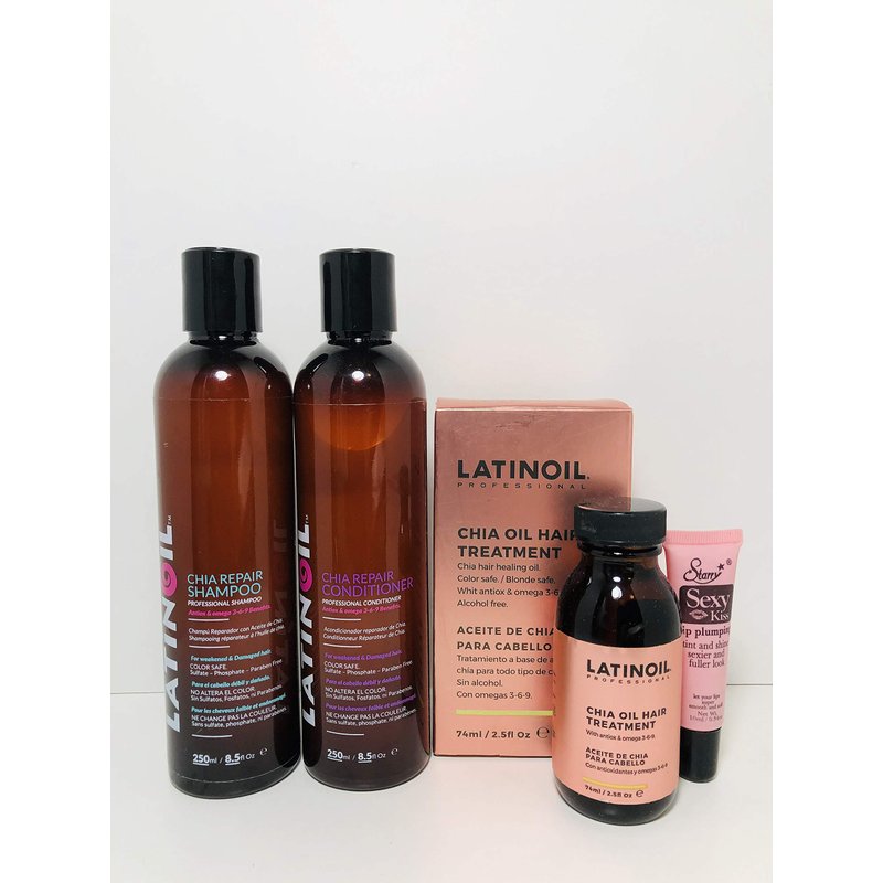 Latinoil Chia Seed Oil Hair Treatment with Omega 3-6-9 Kit) Shampoo 250ml, Conditioner 250 ml, & Oil Treatment 74ml *Free Starry Sexy Lip plumping gloss tube 10ml