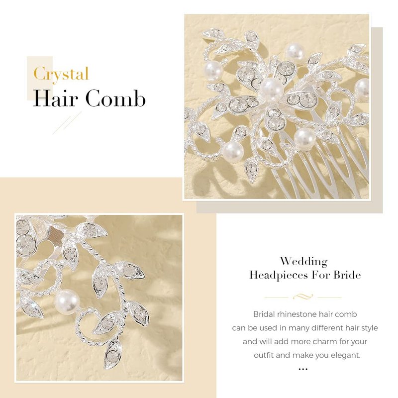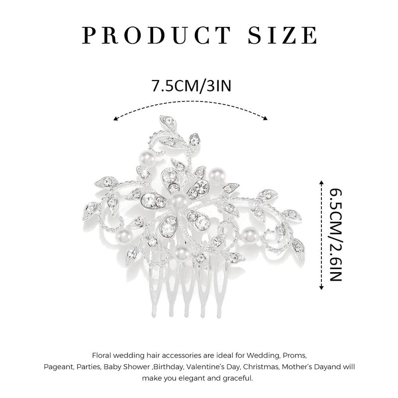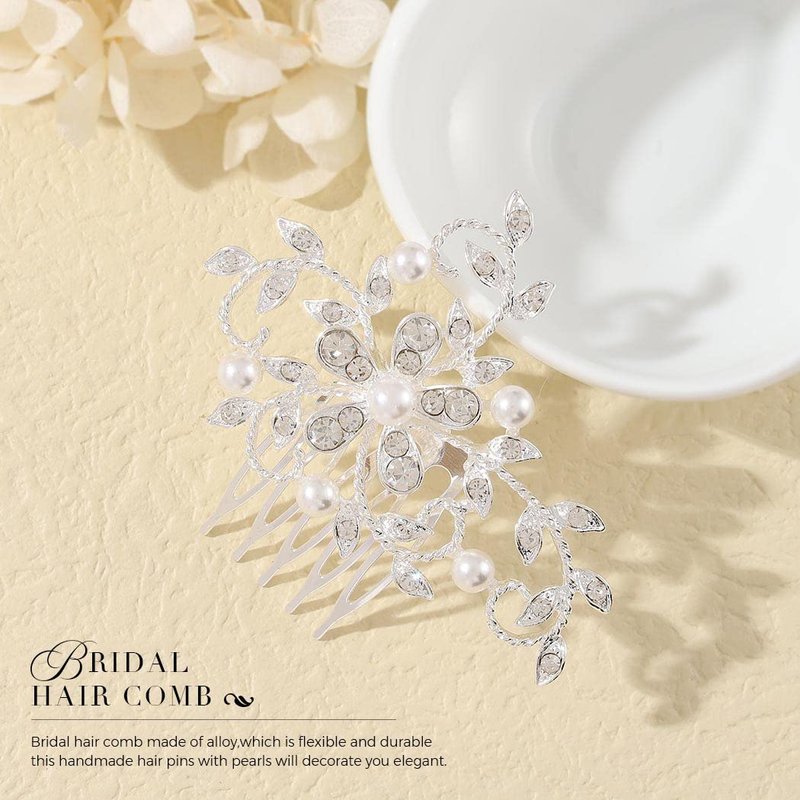 - Floral bridal hair comb made of flowers, exquisite rhinestones, romantic pearl, soft alloy wire, handmade and well crafted. Color: Silver.