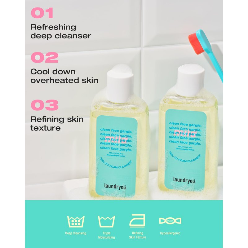 Introducing the ultimate skincare set: Laundryou Clean Face Gargle Gel-to-Foam Cleanser Mild paired with the Pore Cleaning Brush. This duo offers an exceptional daily skincare routine, combining gentle yet effective cleansing with advanced, eco-conscious innovation. The hypoallergenic Gel-to-Foam Cleanser is perfect for all skin types, formulated with Launderma Water and natural extracts to protect and hydrate your skin, leaving it soft and radiant. It effectively shields your skin from pollutants and controls sebum with regular use. Complementing this, the Pore Cleaning Brush, with over 10,000 fine bristles, provides a deep cleansing experience, effectively removing dirt and balancing oil production without harshness. Ideal for use both in the morning to refresh and hydrate and in the evening to thoroughly cleanse away impurities, this set supports healthy, glowing skin. Simple to use, apply a small amount of the cleanser, gently massage using the brush in circular motions, and enjoy the infusion of skincare and laundry care technology that respects both your skin and the environment. This innovative set not only promises cleanliness and comfort but also champions eco-friendly practices, making it a cornerstone for modern skincare routines.