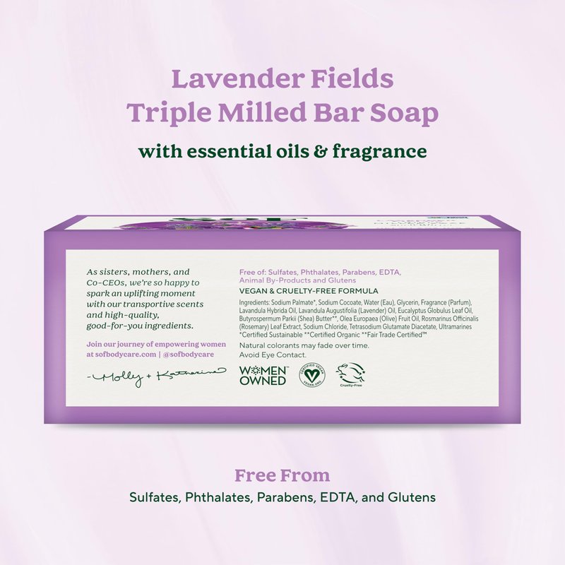 Lavender Fields Clean Bar Soap by South of France Clean Body Care | Triple-Milled French Soap with Organic Shea Butter + Essential Oils | Vegan, Non-GMO Body Soap | 6 oz Bar – 4 Pack - South of France Natural Body Care was founded in 1999. Since then, it has become one of the top-selling brands of all-natural bar soap sold nationally in grocery and health food stores and via online retailers. The original South of France soap formula was developed by a French expatriate in the US and manufactured in France using a traditional Marseille triple-milled recipe. Today, South of France soap is manufactured in the USA, still, kettle cooked in small batches using this traditional Marseille recipe with all natural vegetable ingredients.