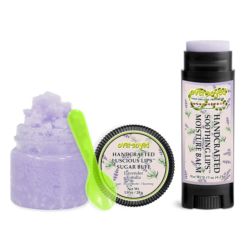 Lavender Vanilla Soothing & Luscious Lips by OverSoyed Exfoliator & Chapped Lip Repair Lip Care Combo | Artisan Handcrafted to Order Floral Lavender Herbal Geranium Wooody Vanilla Flavored Exfoliating Sugar Lip Scrub & Lip Moisturizer Balm Gift Set
