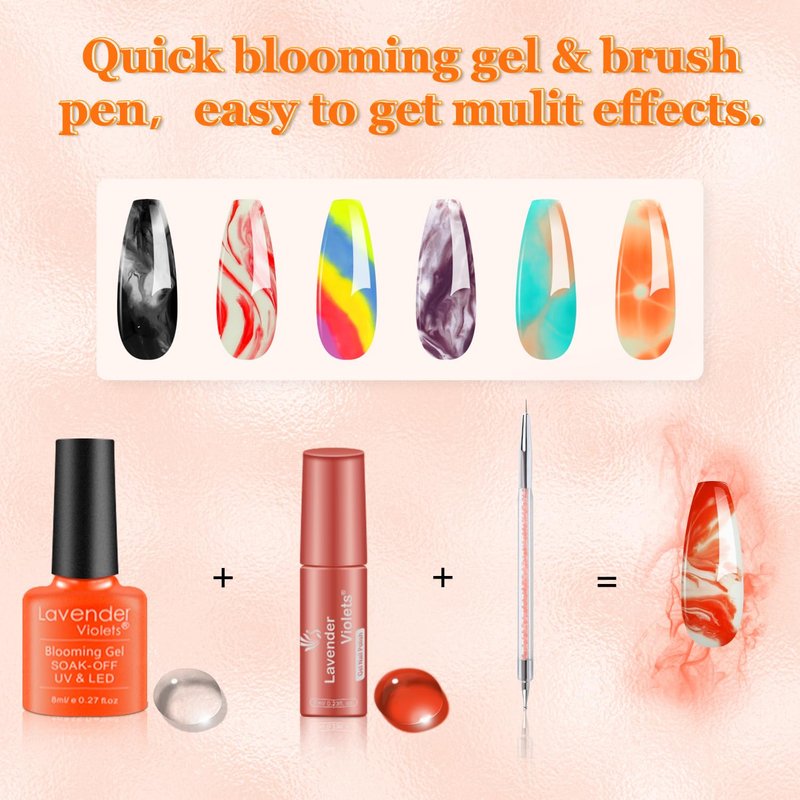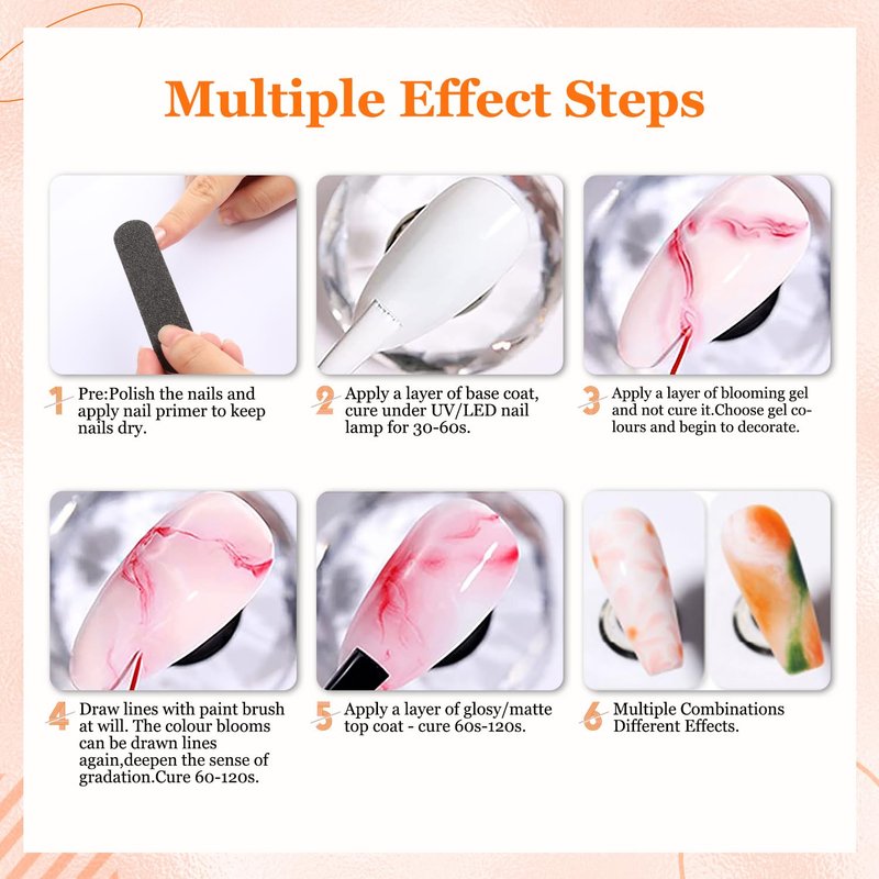 - Blooming Top Gel: The included Blooming Top Coat introduces a new dimension to nail art. When applied, it creates captivating patterns and designs that "bloom" as the polish spreads. This innovative top coat opens up endless possibilities for intricate nail art effects.