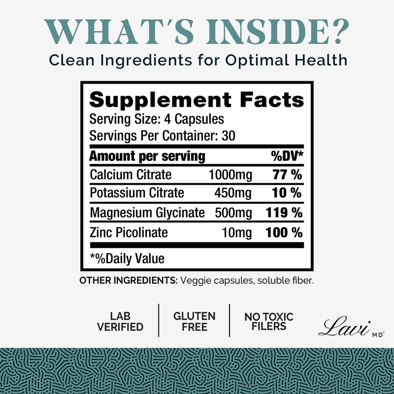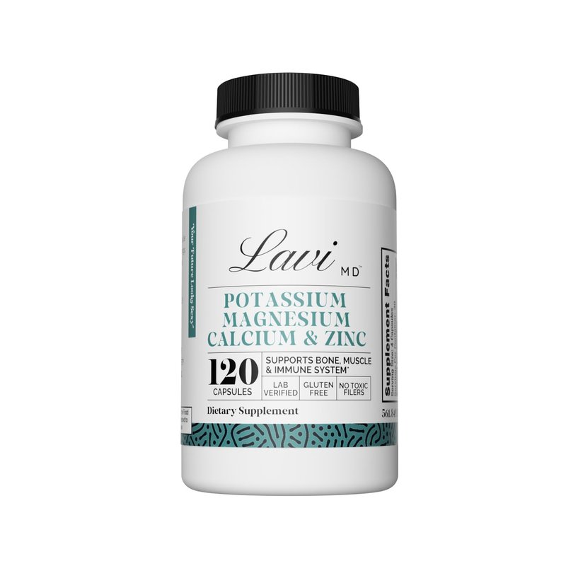 Lavi MD’s Potassium Magnesium Zinc Calcium supplement is designed to provide comprehensive, high-quality mineral support for overall health and well-being. Featuring a potent blend of magnesium calcium zinc, this supplement is crafted to deliver essential minerals for optimal bone strength, muscle function, and immune defense. With a non-GMO formulation that ensures high bioavailability, these minerals are effectively absorbed, helping you feel your best every day. The calcium magnesium potassium in this supplement work together to maintain healthy bones and support muscle relaxation. Zinc and magnesium promote strong immune health and enhance mineral absorption, while calcium magnesium complex contributes to healthy teeth and skeletal structure. Each capsule of this magnesium calcium zinc supplement offers a balanced approach to meeting your daily mineral requirements, helping to reduce occasional muscle cramps and discomfort, while keeping your bones strong and your immune system functioning optimally. Crafted in the USA, this calcium magnesium zinc supplement is made in small batches for superior quality control. Lavi MD's commitment to excellence ensures that our potassium magnesium zinc formula is tested rigorously for purity and potency, making it a high-end choice for those looking to invest in premium supplements. Whether you’re looking to support your bones, muscles, or overall vitality, our cal mag zinc supplement provides the essential mineral combination your body needs. By choosing Lavi MD’s potassium magnesium calcium supplement, you’re opting for a premium solution that’s designed with your health in mind. The synergy of magnesium calcium potassium and zinc magnesium not only supports your body’s natural processes but also enhances absorption for maximum benefit.