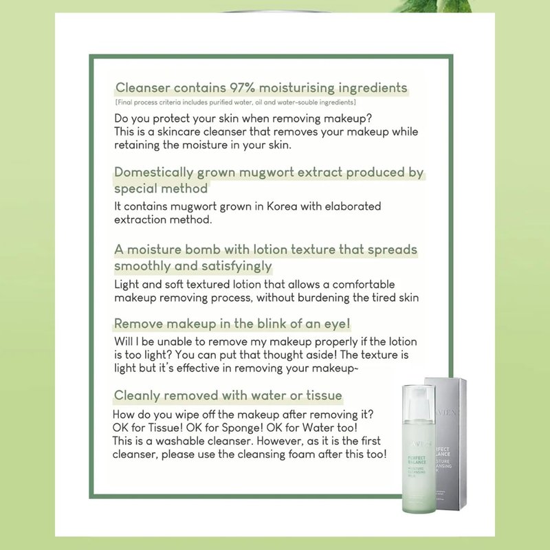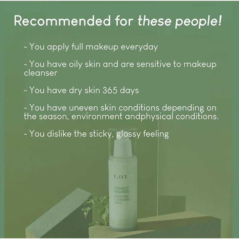 - Moisture Cleansing Milk: LAVIEN Perfect Balance Facial Cleansing Milk provides a soothing cleanse with Korean mugwort extract and 7 natural ingredients, ideal for sensitive skin. This non-irritating hydrating cleanser gently removes dirt and impurities while maintaining your skin's natural moisture balance, making it perfect for daily use.