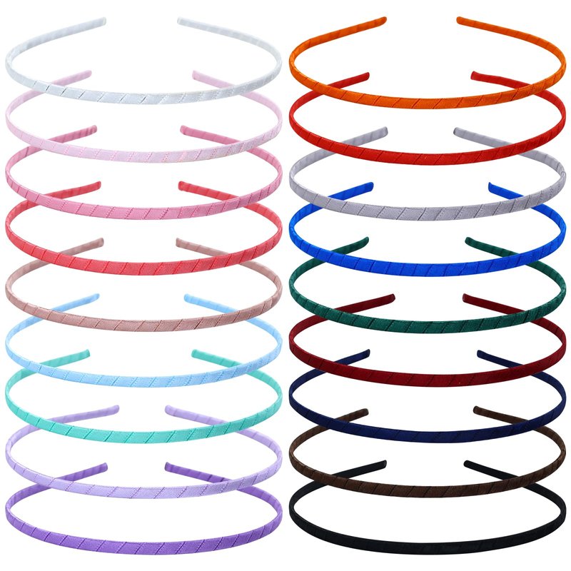 Package includes: 18 pack cloth fabric covered colorful thin metal headbands.