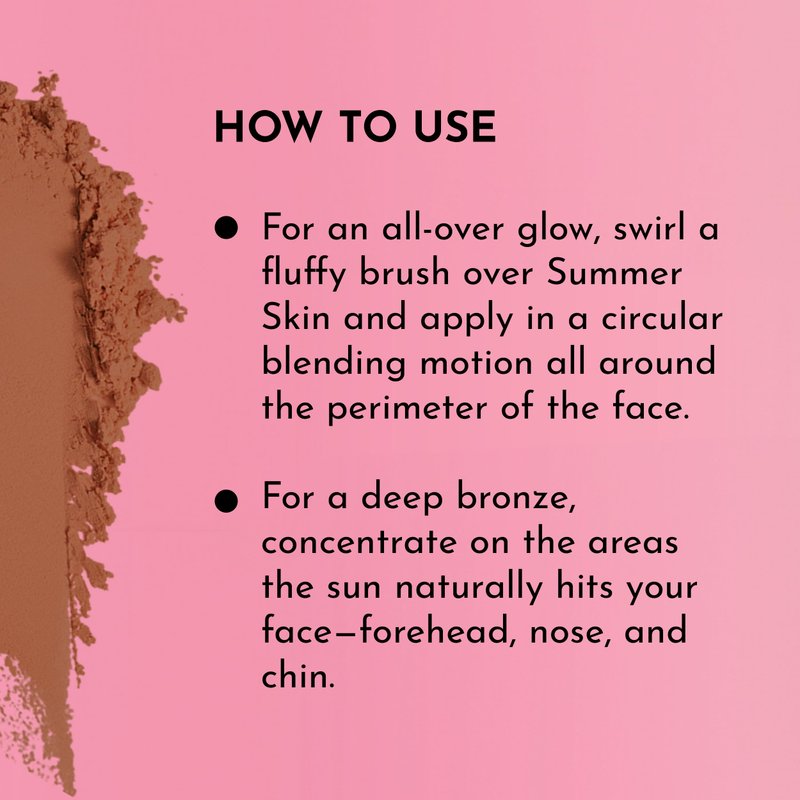- How to Use: For an all-over glow, swirl a fluffy brush over Summer Skin Bronzer and apply in a circular blending motion around the perimeter of your face. For a deeper bronze, focus on areas where the sun naturally hits your face, such as the forehead, nose, and chin.