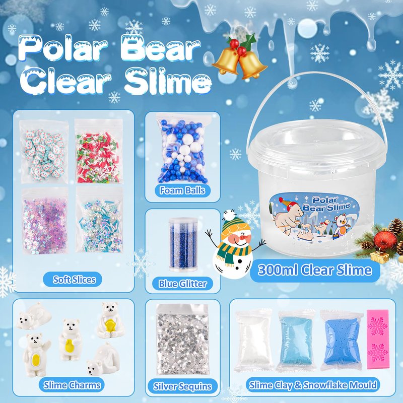 - ☃️【Polar Bear Slime Kit】Our kids slime kit includes 300ml clear slime and 9 packs slime add-ins and 5 cute polar bear slime charms. Create your own unique slime creations with this clear slime set featuring a polar bear with a variety of adorable slime charms and rich soft ceramic slices.