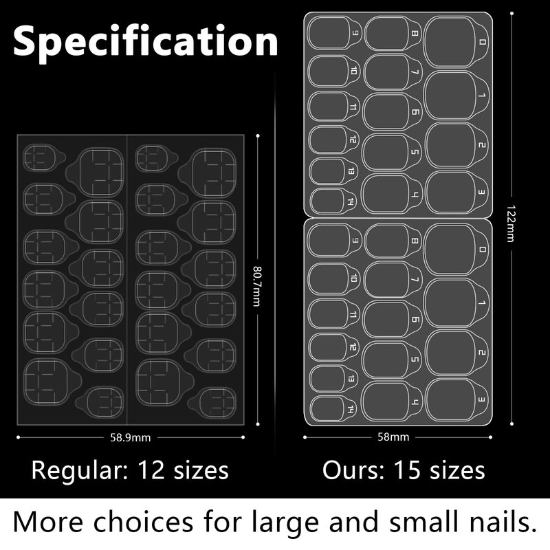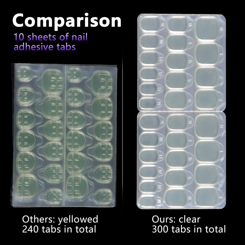 - Content: 10 sheets of double-sided nail glue tabs (30 tabs per sheet, 300 tabs in total). There are 15 different sizes of sticky tabs for nails on each sheet, providing more choices for people with large or small nails to choose from. No crease on the nail tabs, makes it more easy to be peeled off from the plastic film.