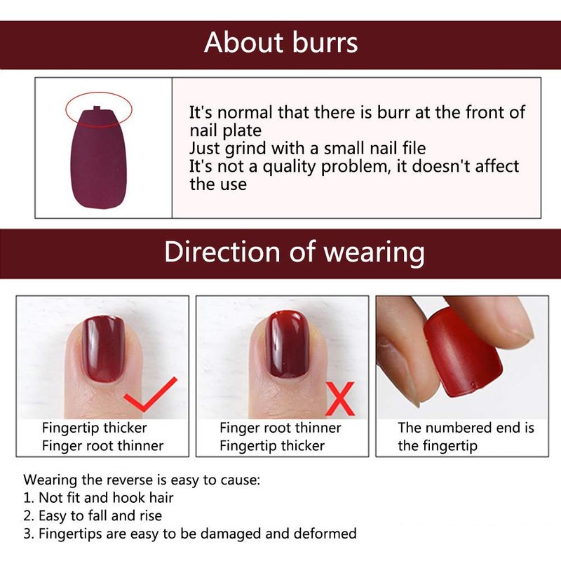 - ♦ Varied Size: The 96pcs fakes nails set offers 10 different sizes that fit most fingers, which is individually numbered 0-9, so they're easy to keep track of, and convenient to choose the suitable size that fits your every finger