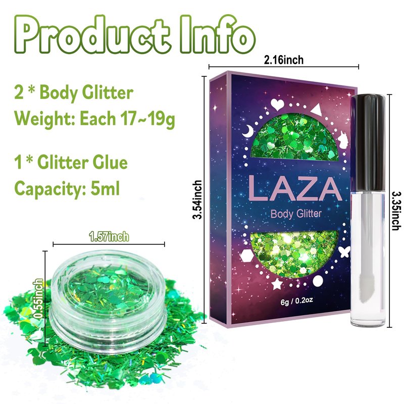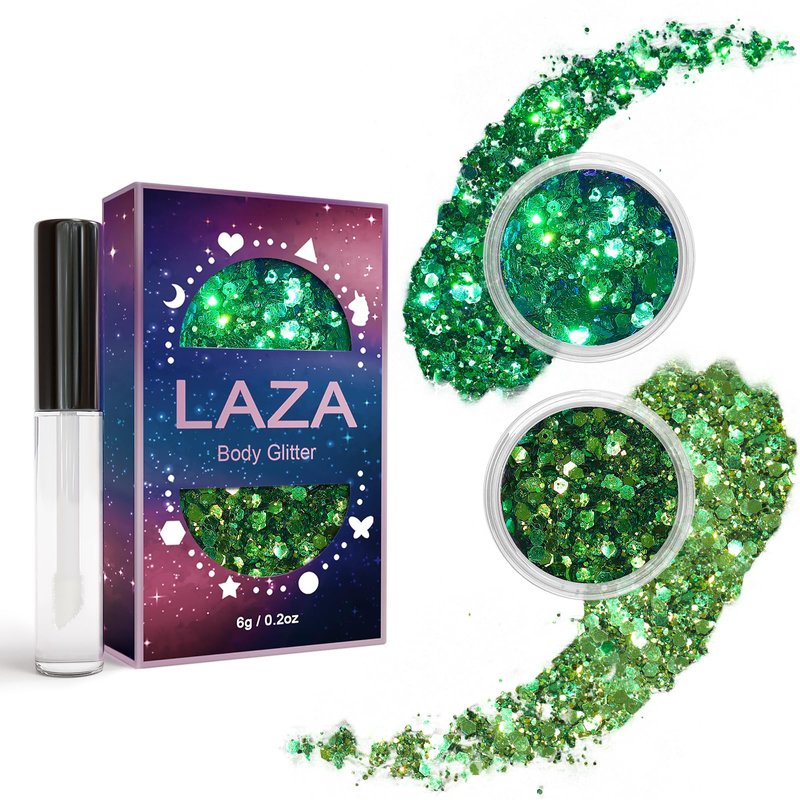 - Laza Body Glitter: This glitter makeup kits mix various sizes of glitter and fine powder, rich colors, there are laser series silver/pink/purple, also blue/green/gold/yellow, and even glow in the dark glitter. In addition to the difference in color, the mixing of sequin shapes is also different. There are stars, heart, hexagon, butterfly, unicorn, and other shapes. You can choose the shape or color you like.
