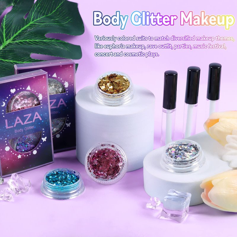 - Laza Body Glitter: 20 glitter makeup kits mix various sizes of glitter and fine powder, rich colors, there are laser series silver/pink/purple, also blue/green/gold/yellow, and even glow in the dark glitter. In addition to the difference in color, the mixing of sequin shapes is also different. There are stars, heart, hexagon, butterfly, unicorn, and other shapes. You can choose the shape or color you like.