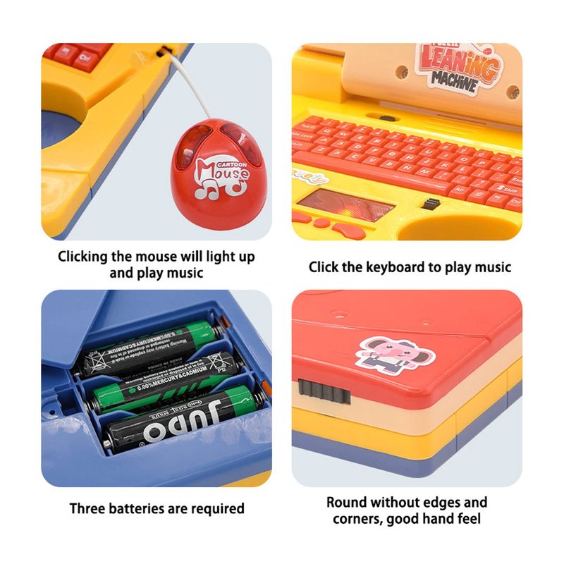 Feature: 1. EDUCATIONAL: The children laptop offers 20 learning activities that teach more than 60 words, spelling, shapes, logic and animals, and the educational electronic toys have a progressive learning level. 2. MUSIC: The learning center plays 30 pieces of popular music, puzzles and logic games to develop critical thinking skills in young children. 3. MOUSE: The children laptop comes with a mouse to develop early computer awareness skills. Click on the keyboard or mouse to play music. 4. SPEAKER: Built in soft and high sound quality speaker will not damage ears of the baby so that the baby can hear more clearly and easily. Provide comfortable musical enlightenment for your baby. 5. SMOOTH EDGE: The smooth surface of this simulation laptop will not damage the little hands of baby. Rounded edge design, no burrs, which is safe to use. Specification: Item Type: Kids Learning Laptop Material: Plastic Close Size: Approx. 19 x 15.7 x 3.8cm 7.5 x 6.2 x 1.5in Unfolded Size: Approx. 17.5 x 19 x 15.5cm 6.9 x 7.5 x 6.1in Batteries: 3 x AA batteries (not shipped with batteries) Package List: 1 x Kids Learning Laptop 1 x Sticker Note: Please note that the style of mouse will be sent randomly, and make sure you will not mind before ordering.