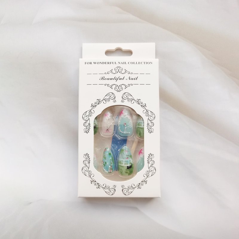 - Package Contains:You will get 24Pcs blue green fake nails with design press on nails in 12 sizes, 1 nail file and 24 jelly glues,1 small wooden stick.