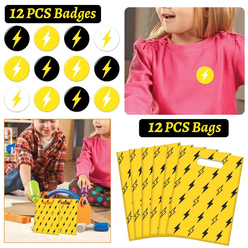 - Complete Party Package: The lightning bolt party favors set includes 12 sheets of lightning bolt temporary tattoos, 12 silicone bracelets, 12 keychains, 12 badges, and 12 plastic goodie bags. This 60piece collection provides everything you need to make your lightning bolt themed party a hit