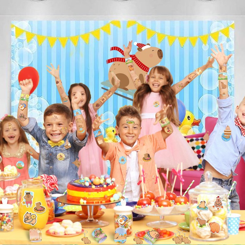 - Package Includes: This set features 50 capybara stickers, 12 sheets of capybara temporary tattoos, 12 capybara slap bracelets, 12 capybara keychains, and 12 capybara badges. This ample assortment ensures you have everything needed to make your capybara party a hit
