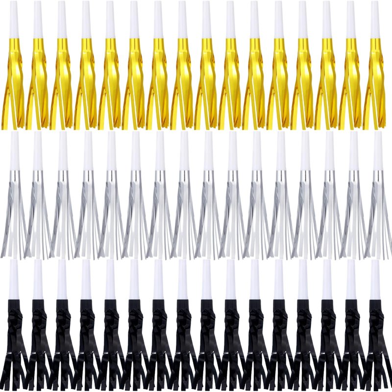 - Fun Party Favors: Set of 48 metallic fringed noise makers in gold and silver black color, perfect for adding excitement and celebration to any party or event.