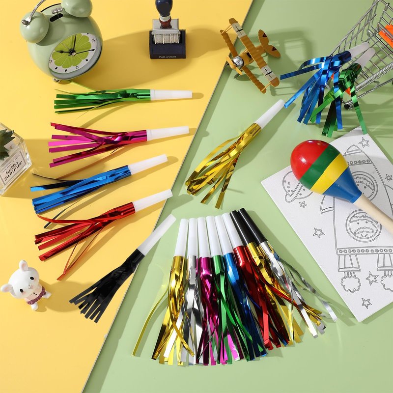 - Festive Party Favors: Set of 48 metallic fringed noise makers in a sleek black color, this set ensures you have enough noise makers for all your guests to join in the celebration, for perfect for baby showers, kids' birthday parties, and New Year's celebrations.