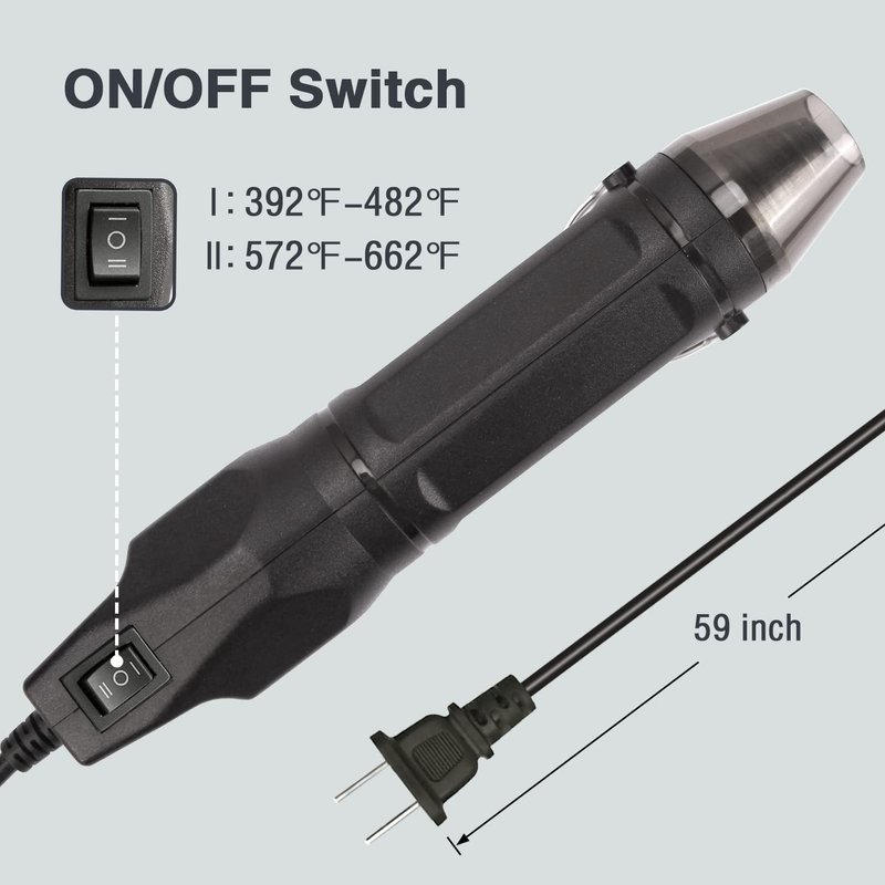 - 【PERFECT HEATING TOOL】: The electric mini heat gun can reach to temperature 392℉ (200℃)and 662℉ (350℃) within seconds to make your work more efficiently. 4.9ft long cable helps you do crafting more conveniently.