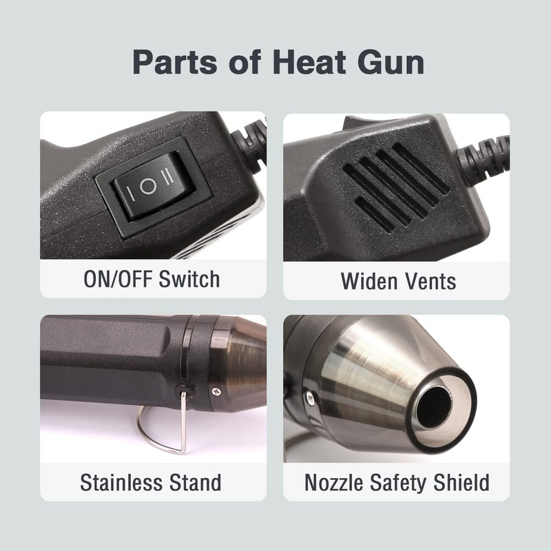 - 【SCIENTIFIC ERGONOMIC DESIGN】: Lightweight makes the hot air gun fit comfortably in your hand. And the mini heat gun is especially ideal for getting into hard-to-reach places and concentrating high heat on the tight area. Retractable metal bracket lets this heat shrink gun stand on the table stably and use it hands-free.