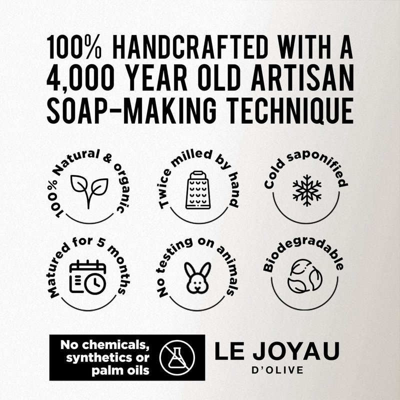 Embrace traditions with LE JOYAU D’OLIVE. For over two centuries, our family has diligently worked together to perfect the art of natural handcrafted soap, handcrafting each bar with unwavering dedication using only what nature provides; no synthetics, no chemicals, and no palm oils.