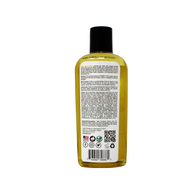 LeKair Vegan formula products are made with uniquely blended natural oils to give you vibrant, healthy, and youthful-looking hair, skin and nails. Vitamin E is packed with nutrients to help restore, moisturize and prevent dryness in hair, skin and nails. Excellent for all hair textures including natural styles, braids, extensions, and chemically-treated or color-treated hair. Directions: Rub desired amount of VITAMIN E Oil in hands. Apply by massaging into skin, hair and cuticles. Leave on overnight for maximum absorption. Ingredients: Olea Europaea (Olive) Fruit Oil, Tocopheryl Acetate (Vitamin E), Prunus Amygdalus Dulcis (Sweet Almond) Oil, Simmondsia Chinensis (Jojoba) Seed Oil, Ricinus Communis (Castor) Seed Oil, Fragrance (Parfum).