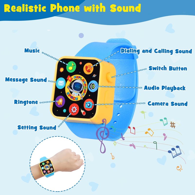 - Pretend Phone and Smartwatch Toy- Really cool features of this pretend play purse set is that the phone and the watch are interactive. Both of them make real life sounds and have lights. The fun animations and different activities introduce the child to numbers and counting, add and subtract, conversational skills, and social skills.Suitable for early role-play at home and on the go!