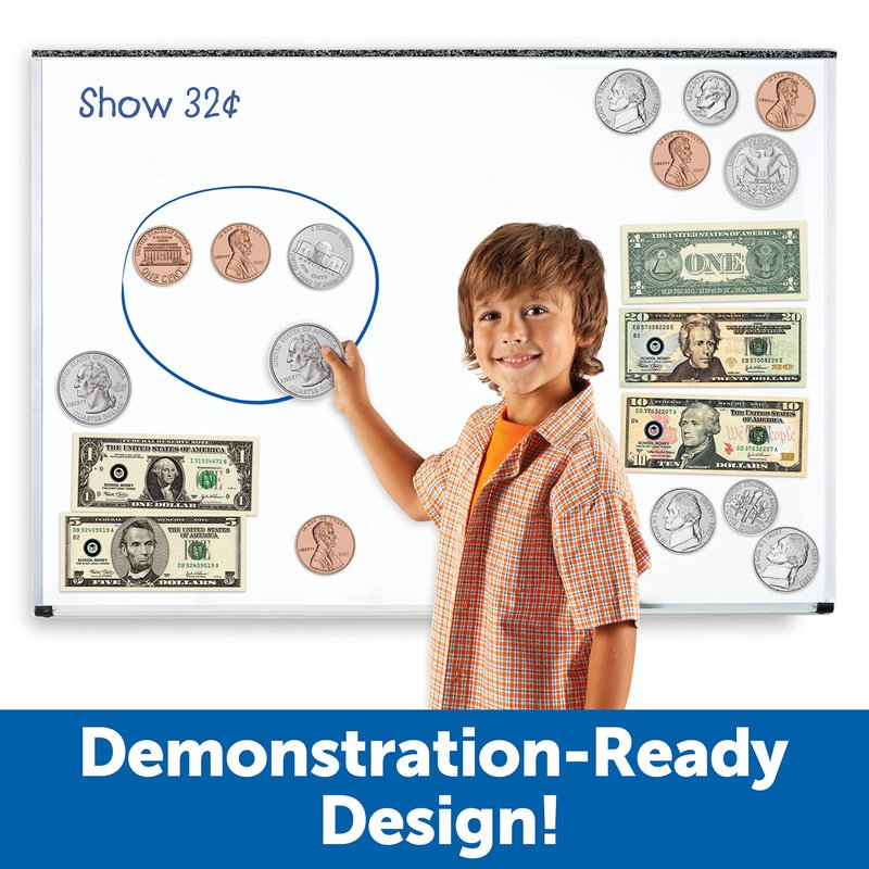 - 45-piece set includes 36 coins (pennies, nickels, dimes, and quarters) at 4x actual size, 9 bills (1-, 5-, 10-, and 20-dollar bills) at 1.5x actual size.AGES 5+