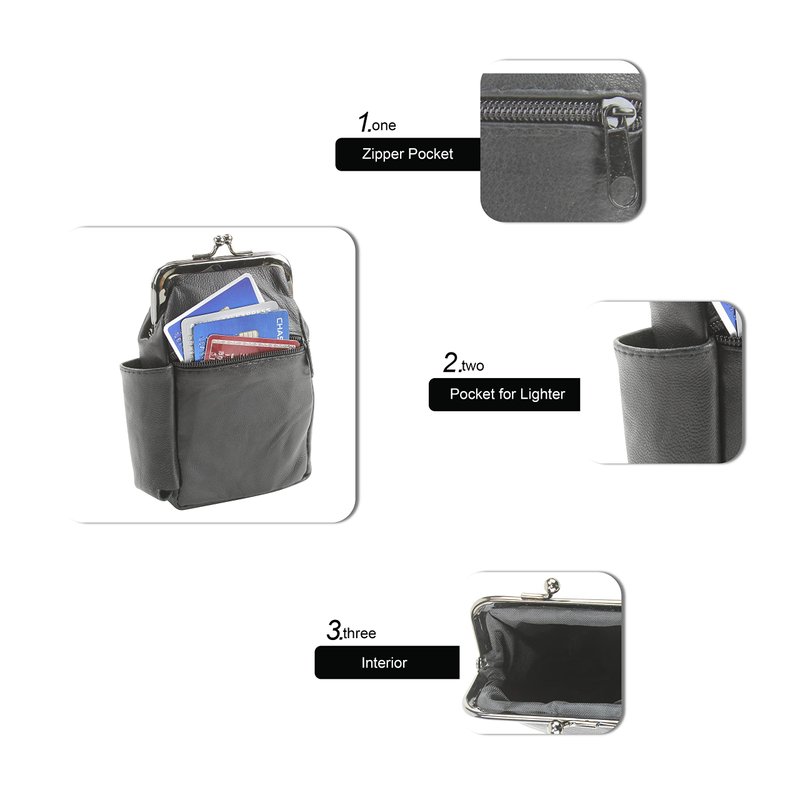 Our Genuine Lambskin Leather Cigarette and Lighter Case with Twist Clasp measures at 4” high x 5.5” wide and compact enough to fit easily in your pocket. Perfect fit for lighters and comes with 2 zipper pockets for cards, cash, and keys, you can have everything on hand in this one cigarette case.