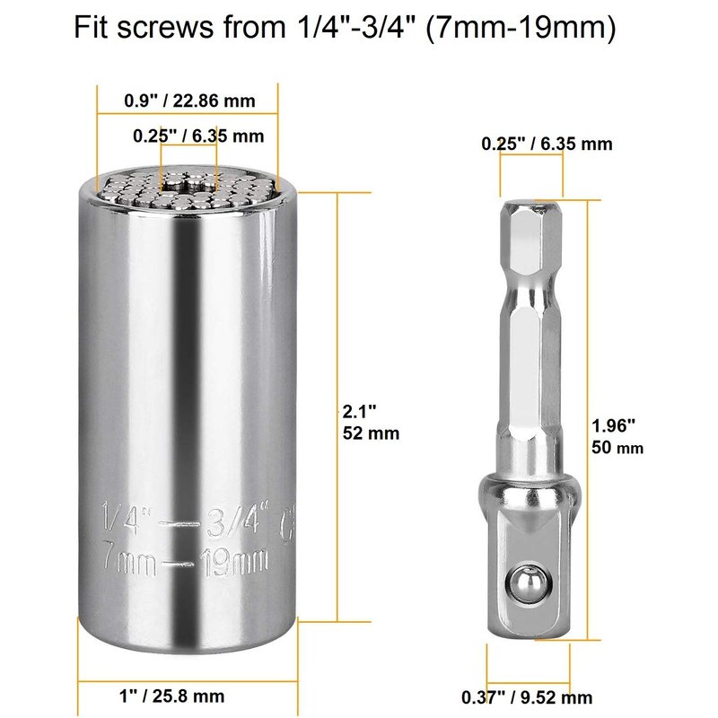 【UNIQUE DESIGN】Unique design automatically adjusts to any size or shape, compact and easy to carry. Fits standard 1/4 to 3/4-inch and metric 7-19mm nuts and bolt heads. Unscrew most bolts, various shapes nuts, screws, hooks, and other odd shape fasteners that you don't have the right tool for. 【MULTIL TASK】Stainless steel construction with 54 individual hardened carbon steel spring pins that retract to the shape of most objects. This durable and universal wrench can be applied automotive industry, household maintenance, manufacturing industry, construction and other industries. 【UNIVERSAL SOCKET】Turn your tools instantly into a socket driver to grip hex nuts, hooks, eye and lag screws, bolt heads, and other various shape and size objects. Included power drip adapter can be attached to power drills or ratchet wrenches. This magic grip is perfect for DIY, construction, home improvement, auto repair, manufacturing industry and other handy jobs. 【BONUS PACK】Package contents: 2 x Leberna Universal Socket Adapter; 2 x Power Drill Adapter. 【SATISFACTION GUARANTEED】If for any reason you are not satisfied, return within 30 days. No question asked.