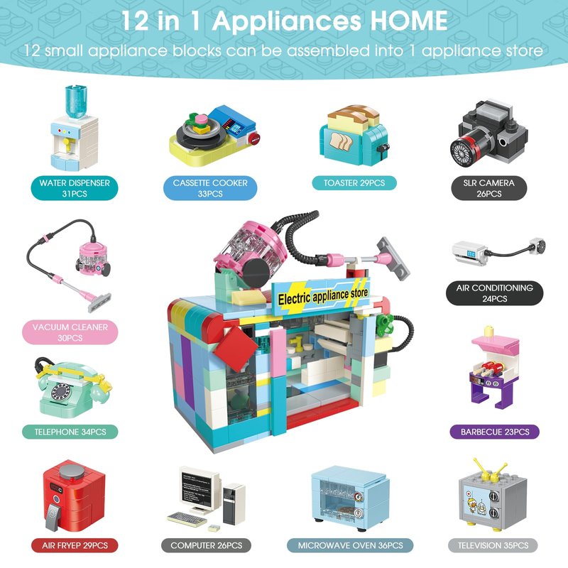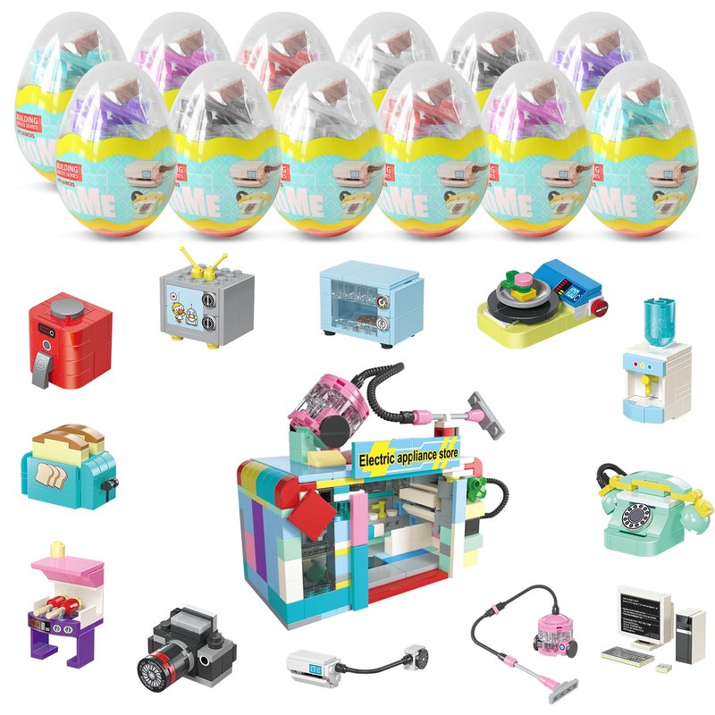 • 【SURPRISE PLAY】The mini appliance bulding block set includes 12 toy eggs, household items such as camera, TV, vaccum cleaner, and kitchen appliances such as toaster, air frye and babecue. The best part is that the 12 mini eggs can be combined into an big appliance store.