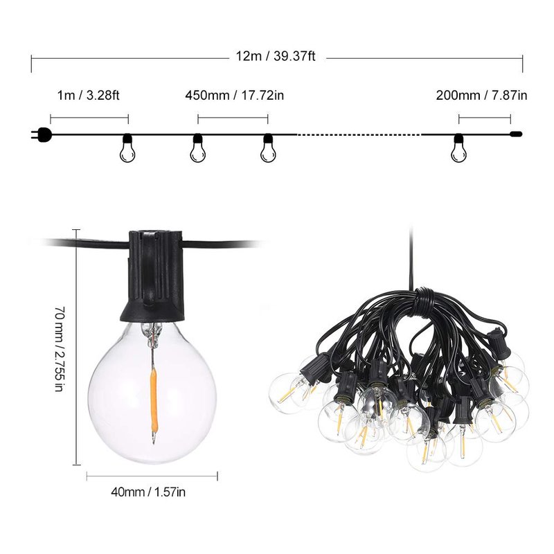 - ❤【25 Sockets G40 LED String Lights】: 40ft long patio string lights with 25 suspended sockets, 1.5ft/bulb, 28 x 1 watts G40 LED bulbs included, 3 spare bulbs.
