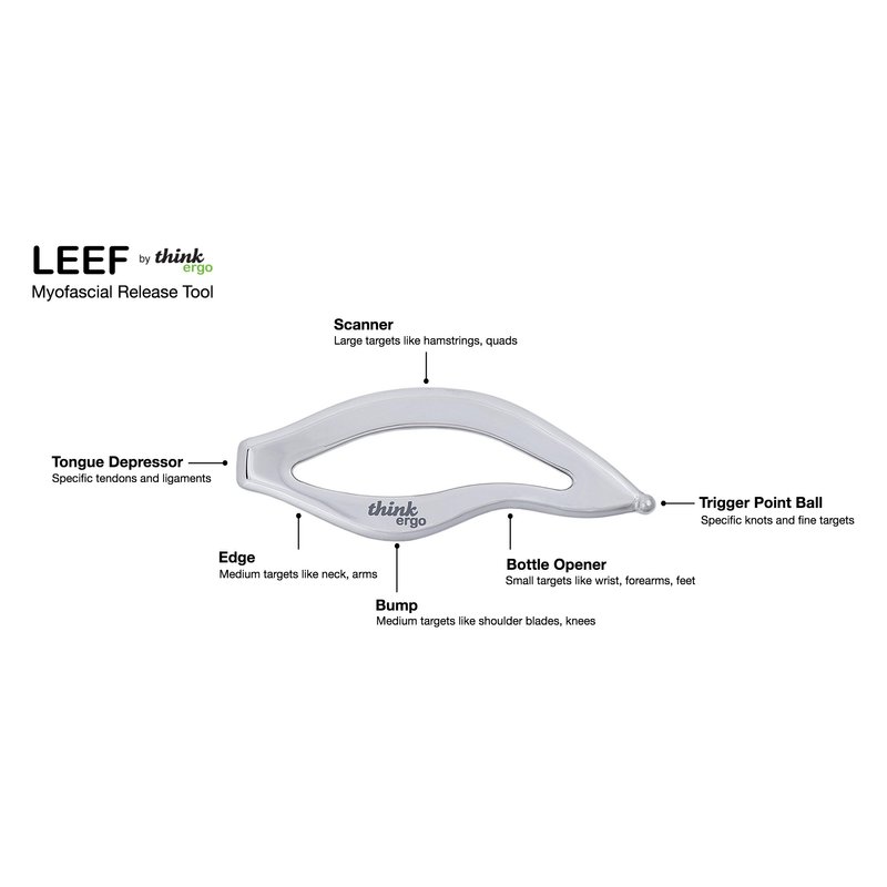 At Think Ergo, we created a myofascial release tool that could relieve muscle pain and tightness across the entire body. The LEEF is a professional grade double-beveled edge tool machined from stainless steel. Our polished finish provides a smooth glide to help erase your muscle tightness and strains. Each edge of the LEEF tool is shaped to treat both small and large muscle groups. There is even a ball tip to perform trigger point therapy and target specific knots. LEEF's curved and ergonomic leaf shape fits the contours of your hand for an easy one-handed grip to work muscle tension out, without wearing you out. Speed up recovery and regain your mobility by using LEEF. With LEEF, relief lies in the palm of your hand.