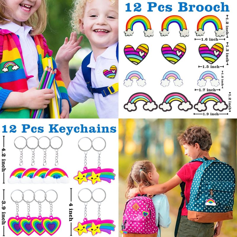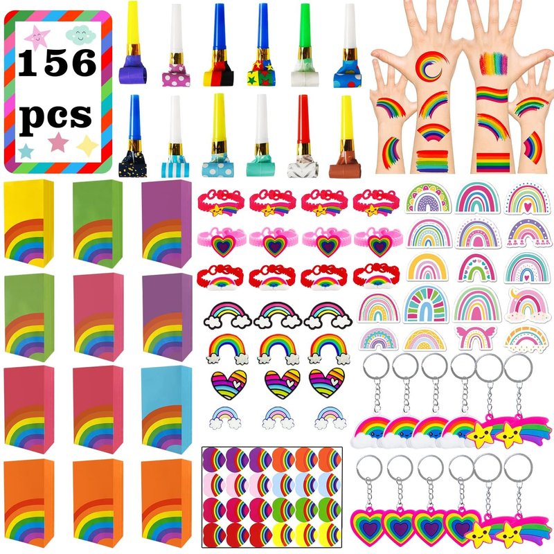 - 【Variety of Rainbow Party Favors】Totally 156 pcs Leesgel rainbow party favors, includes: 12 x Rainbow Brooch, 12 x Rainbow Bracelet, 12 x Rainbow Tattoos, 12 x Rainbow Whistle, 12 x Rainbow Keychain, 12 x Rainbow Goodie Bags, 60 x Rainbow Stickers, 24 x Rainbow Lables for Sealing.