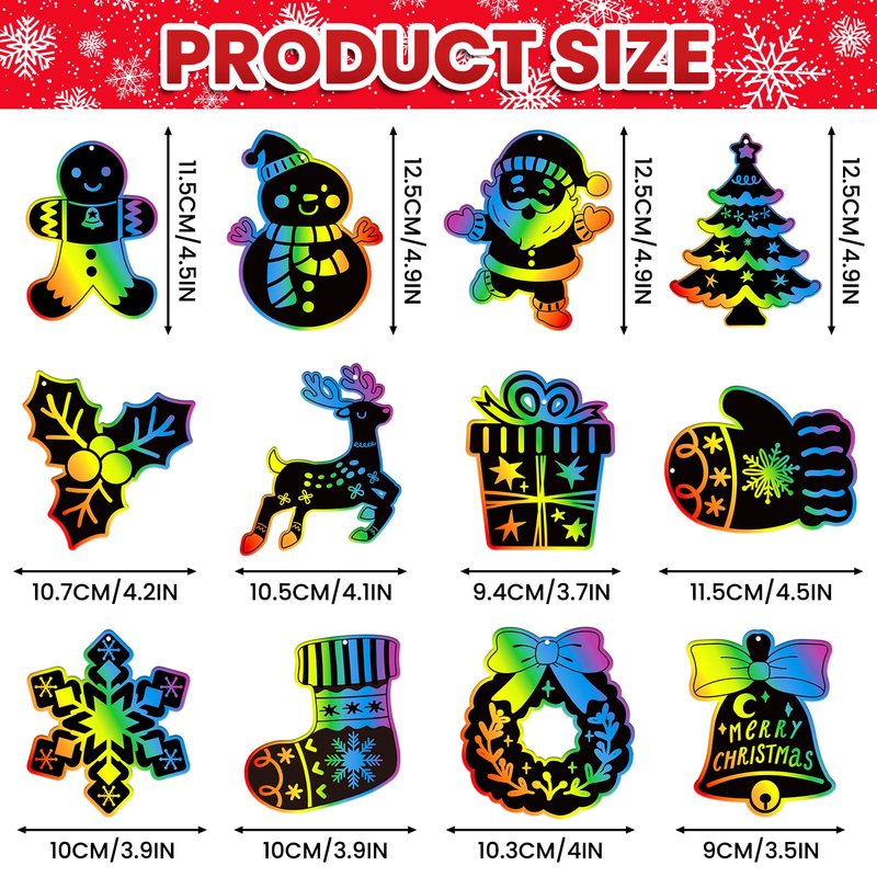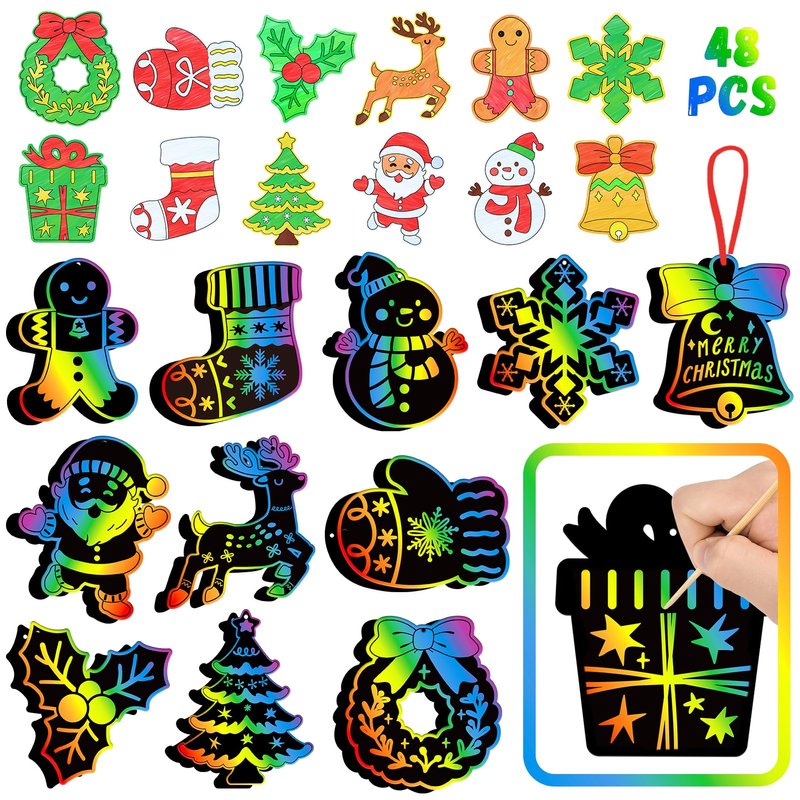 - Christmas scratch cards are available in two quantities: 96pcs or 48pcs. Christmas scratch paper art set includes 12 different shapes of Christmas scratchcards (96pcs/48pcs), decorative ribbons and wooden sticks.