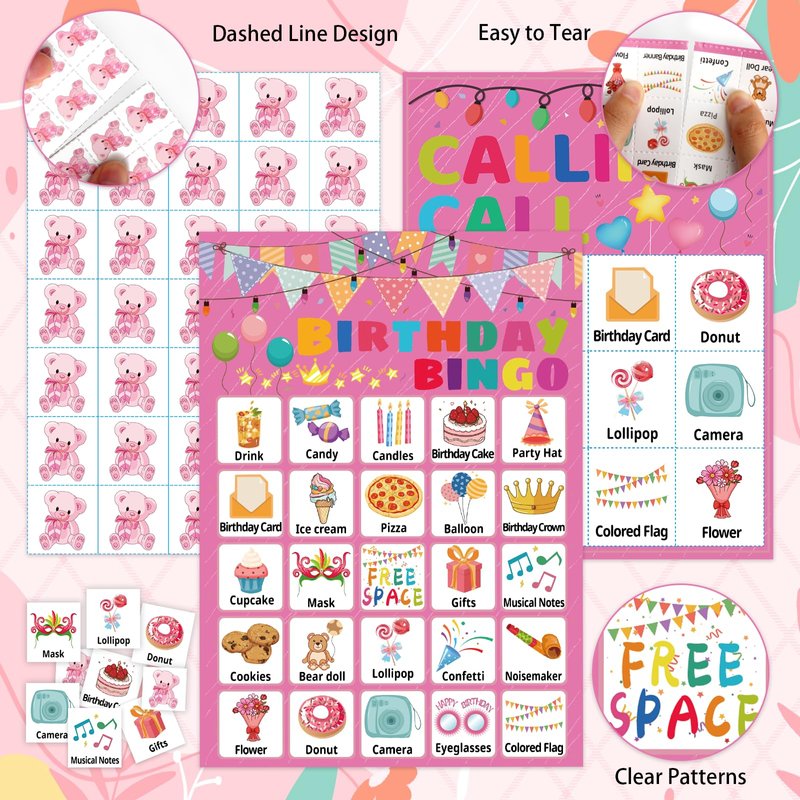 - Cute Design:Our birthday bingo game for boys girls are specially designed for birthday parties, with balloons, birthday crowns, birthday cakes, candies, confetti and other rich birthday party elements, vibrant pink colors and vivid patterns, kids will love it.