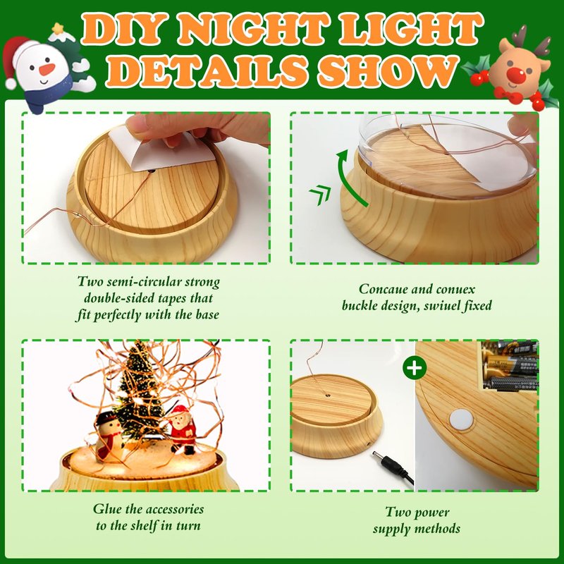 - PREMIUM MATERIAL: Christmas night light made of high-quality ABS material, durable, the lampshade is designed with transparent snaps, which not broken. DIY night light kit bottom is made of wooden material, smooth and firm, USB charging (batteries not included), convenient and practical, suitable for decorate children's bedrooms.