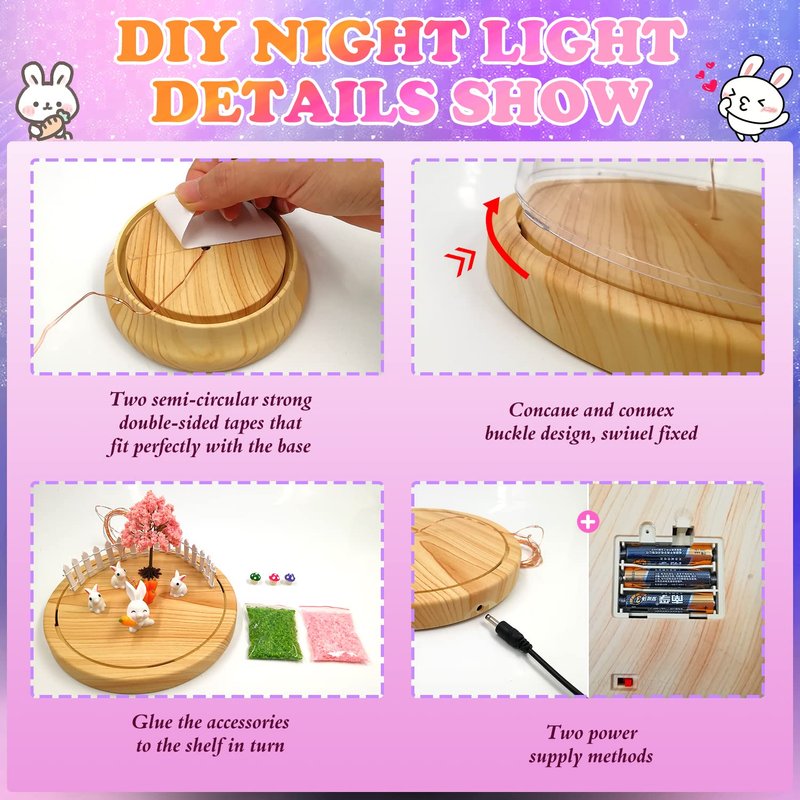 - EASY TO OPERATE: DIY night light decor, operation steps are simple, easy to assemble, no experience required. Operation steps: you need to stick the film, paste the small accessories, wind the filament, and close the lid,you can enjoy the beautiful scenery brought by bunny toys, the fairy-tale lighting creates a warm atmosphere.