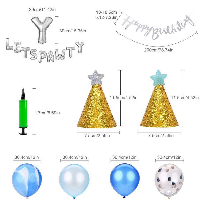- Single Size: Latex Balloon: 12in, sequin diameter 2.5cm(0.98in); Foil Balloon: L*W: 39*29cm(15.35*11.42in); Hat: D*H: 7.5*11.5cm(2.95*4.52in); Banner: String length 2m(6.56ft), one letter height 13-18.5cm(5.12-7.28in); Inflator: L*W: 17*3.5cm(6.69*1.38in)