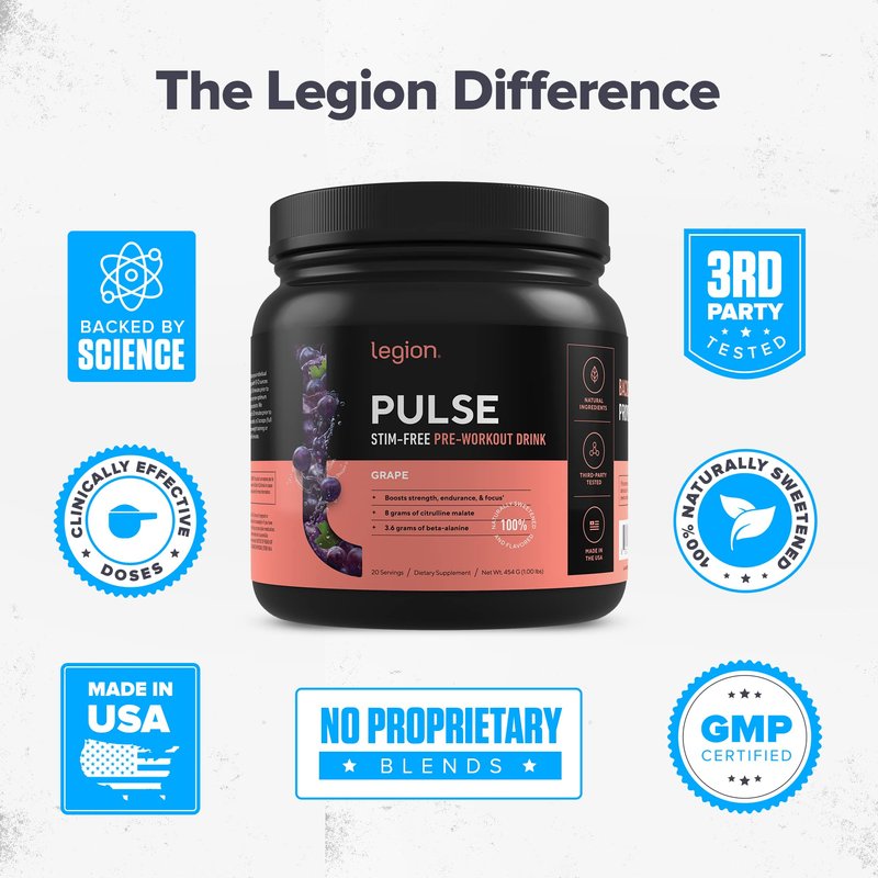 LEGION Pulse Pre Workout Supplement - All Natural Nitric Oxide Preworkout Drink to Boost Energy, Creatine Free, Naturally Sweetened, Beta Alanine, Citrulline, Alpha GPC (Caffeine Free Grape)