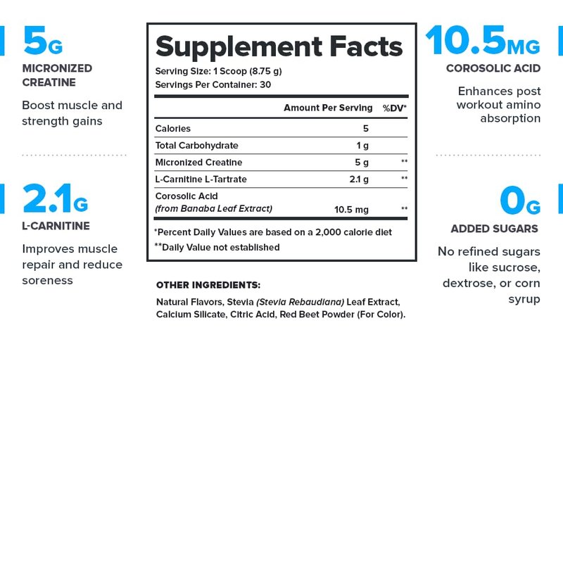 - Clean creatine powder for men and women and transparent label that shows exactly what’s in every serving of our recovery drink and what’s not (no proprietary blends or hidden ingredients).